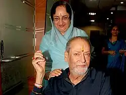Kapoor met actress Geeta Bali in 1955, during the film Miss Coca Cola. They fell in love while shooting of the film Rangeen Raaten, where he was the leading actor and she played a cameo. Four months later, the couple got married at Banganga Temple, near Malabar Hill of Mumbai.[36] They had a son, Aditya Raj Kapoor, on 1 July 1956, at Shirodkar's Hospital, Mumbai, a year after they were married. Five years later, in 1961, they had a daughter, Kanchan Kapoor.[37] Bali died on 21 January 1965, at the age of 35, due to illness from smallpox.[38] Four years later, Kapoor married Neila Devi Gohil, a princess of the Gohil dynasty of Bhavnagar State, on 27 January 1969.[39]