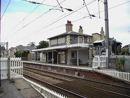 The station was opened by the Eastern Counties Railway in 1845[1] and later became a junction with the opening of the Stour Valley Railway from Haverhill on 1 June 1865.[2] The subsequent completion of the line onwards to Sudbury a few months later created a through link with Colchester on the Great Eastern Main Line. This was used by through holiday trains between Clacton-on-Sea and the Midlands in LNER and British Rail days but then fell victim to the Beeching Axe, closing to all traffic on 6 March 1967.[3] However, the line between Sudbury and Marks Tey is still in use today.