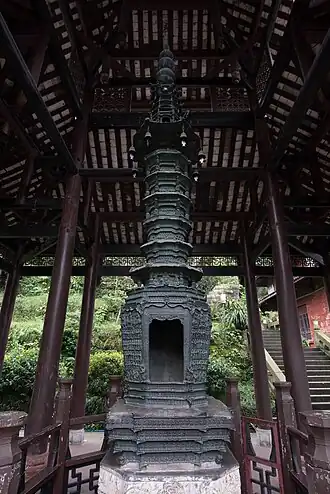 Shengji Temple Bronze Pagoda(Chinese: 聖積寺銅塔) is located in Fuhu Temple, Mount Emei, Sichuan. It is named for its original location in Shengji Temple. The pagoda, also known as the Huayan Bronze Pagoda(Chinese: 華嚴寺銅塔), is cast with the text of the Avatamsaka Sutra and scenes depicting the seven places and nine assemblies(Chinese: 七處九會) where the Buddha is said to have preached.[1] It is the earliest large-scale bronze pagoda still existing in China.[2]