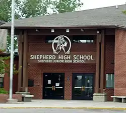 Shepherd School District (a combination of the elementary and high school districts) educates students from kindergarten through 12th grade.[7] Shepherd High School's team name is the Mustangs.[8]