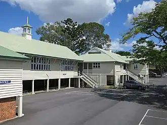 With the arrival of the Southern and Western railways (Brisbane and Ipswich extension) as far as Oxley West in 1874,[19] improved access led to a population increase in the area. The land surrounding the school grounds was subdivided into smaller lots, through which roads were surveyed that would later become McCulla Street and Hall Street.[20] Enrolments at West Oxley fluctuated, from 135 in 1869, to 72 in 1873, and 160 in 1877.[21] In May 1878 the name of the Oxley West railway station changed to Sherwood railway station, and in the same year the school became known as Sherwood State School.[22][23] By 1885, enrolments at Sherwood State School had increased to 180 students and the following year events were being held at the school to raise funds for school improvements.[24][21] In October 1887 a tender of £318 10s by A Byrne was accepted, and an additional classroom wing was built perpendicular to the original school building.[25][26][27][28][1]