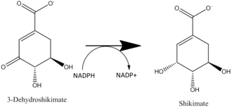 There are seven enzymes that play a role in this pathway. Shikimate dehydrogenase (also known as 3-dehydroshikimate dehydrogenase) is the fourth step of the seven step process. This step converts 3-dehydroshikimate to shikimate as well as reduces NADP+ to NADPH.
