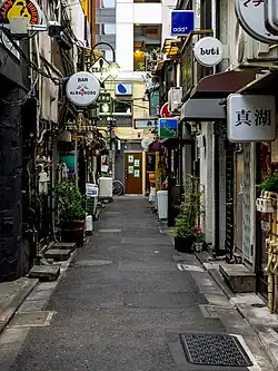 Shinjuku Golden Gai (Japanese: 新宿ゴールデン街, Hepburn: Shinjuku gōruden-gai) is a district of Kabukicho within Shinjuku, a special ward of Tokyo, Japan.[1] It is composed of a network of six narrow alleys, connected by even narrower passageways which are about wide enough for a single person to pass through. Over 200 tiny shanty-style bars, clubs and eateries[2] are squeezed into this area.