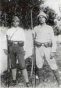 Graduates of Herzliya Gymnasium in uniform in Constantinople, 1916. Standing: Dov Hoz, Moshe Sharett, and Yeivin. Seated: David Beit Halachmi, Avshalom Gissin, and Moshe Gvirtzman.