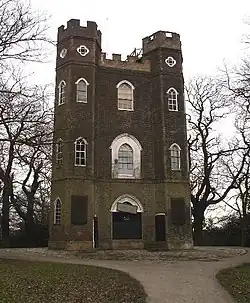 Another water tower (of 130 ft) is further west down Shooter's Hill. This was originally built in the 1890s to designs by Thomas W. Aldwinckle to supply water to the 'Brook Fever hospital', which was demolished in the 1990s, to be replaced by a housing development. The tower consists of a plain brick pillar ornamented simply with bands of terracotta tiles and windows like arrowslits. It is not listed, but it was cleaned, repointed and underpinned for conversion into a family home. It is the centrepiece of the housing estate.[10]