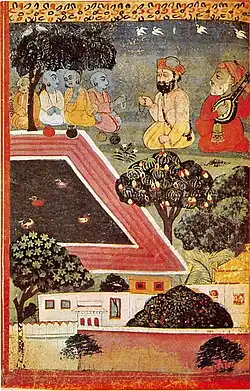 Depiction of Guru Nanak and Mardana in-dialogue with Siddhas in Achal Batala. Painting is from the B-40 Janamsakhi manuscript completed in 1733.