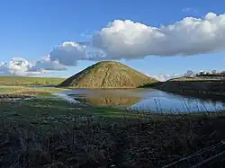 The base of the hill is circular and 167 metres (548 ft) in diameter. The summit is flat-topped and 30 metres (98 ft) in diameter. A smaller mound was constructed first, and in a later phase much enlarged. The initial structures at the base of the hill were perfectly circular: surveying reveals that the centre of the flat top and the centre of the cone that describes the hill lie within a metre of one another.[7] There are indications that the top originally had a rounded profile, but this was flattened in the medieval period to provide a base for a building, perhaps with a defensive purpose.[9]