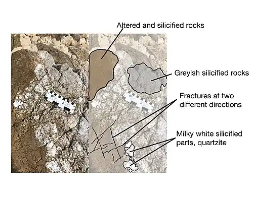 The Barberton Greenstone Belt in South Africa, specifically the Eswatini Supergroup of around 3.5–3.2 Ga, is a suite of well-preserved silicified volcanic-sedimentary rocks. With the composition ranging from ultramafic to felsic, the silicified volcanic rocks are directly beneath the bedded chert layer. Rocks are more silicified near the bedded chert contact, suggesting a relationship between chert deposition and silicification.[28] The silica altered zones reveal that hydrothermal activities, as in seawater circulation, actively circulate the rock layers through fractures and fault during the deposition of bedded chert.[29] The seawater was heated up and therefore picked up silicious materials from underneath volcanic origin. The silica enriched fluids bring about silicification of rocks through seeping into porous materials in the syn-depositional stage at a low-temperature condition.[29][30]