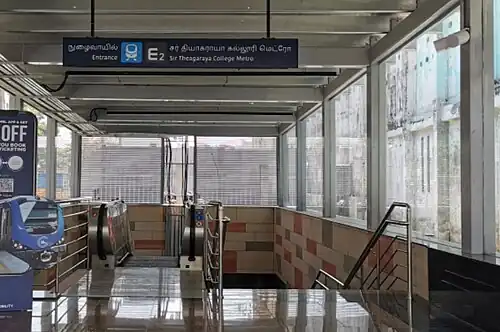 Sir Theagaraya College is an underground station on the North-South Corridor of Line 1's Blue Line Extension of Chennai Metro in Chennai, India. This station will serve the neighbourhoods of Old Washermanpet and other northern suburbs of Chennai.