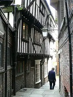 Early in the 19th century, the easternmost part of the house was demolished, and replaced by the Golden Fleece pub.[2][3] In 1869, an extension was added to the southernmost section of the house. This rearmost section is now a separate property, listed at Grade II*.[5] Around this time, a single-storey extension was added in front of the entrance on Lady Peckett's Yard, and the facade on Pavement was renovated. By the 1920s, the house was in use as a drapers' shop, with a warehouse to the rear. It had become dilapidated, and the Victorian external plastering with fake stonework had fallen out of favour. Francis W. B. Yorke restored the property, for use by an insurance company. He exposed the timber framing, and added new external decoration, windows and finials based on surviving examples. Internally, he discovered small sections of wall paintings and paintings on beams in the main hall, and he restored paneling in the first floor parlour, in part by using paneling from the second floor.[2][3]