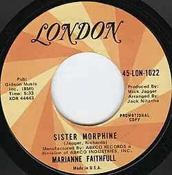 "Sister Morphine" is a song written by Marianne Faithfull, Mick Jagger and Keith Richards. Faithfull released the original version of the song as the B-side to her Decca Records single "Something Better" on 21 February 1969.[1] A different version was released two years later by the Rolling Stones for their 1971 album Sticky Fingers.[2]
