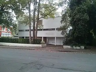 Six Pillars is in Sydenham in the London Borough of Southwark, opposite Dulwich Wood.[1] It is the only modernist house in its street as the other houses are more ordinary townhouses or Victorian villas.[1] Six Pillars was built by architect Valentine Harding, who was working for Tecton Group.[2][3] The company also built Highpoint I and the penguin enclosure at London Zoo, both of which are listed Grade I.[4] It is one of four houses built by Harding, who died at the Battle of Dunkirk in 1940.[4] It was built in the style of Villa Savoye, built by Le Corbusier,[5] and contains "glascrete" (concrete containing glass) to maximise the amount of sunlight in the house.[4]