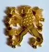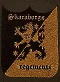 The coat of the arms of the Skaraborg Regiment (P 4/Fo 35) 1977–1994, the Skaraborg Brigade (PB 9/MekB 9) 1994–2000 and Skaraborg Regiment (P 4) since 2000. Blazon: "The provincial badge of Västergötland, per bend sinister sable and or charged with a double-tailed lion rampant counterchanged, armed and langued gules between two estoiles argent in the first field. The shield surmounted two arms in fess, embowed and vambraced, the hands holding swords in saltire, or".[8] The coat of arms of the Skaraborg Regiment (P 4/Fo 35) 1994–2000 and the Skaraborg Group (Skaraborgsgruppen) since 2000. Blazon: "The provincial badge of Västergötland, per bend sinister sable and or charged with a double-tailed lion rampant counter-changed, armed and langued gules between two estoiles argent in the first field. The shield surmounted two swords in saltire, or".[8]