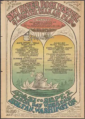 The Sky River Rock Festival and Lighter Than Air Fair was a historic rock festival first held on a raspberry farm on the Skykomish River outside Sultan, Washington. The 1968 rock festival was held between August 31 to September 2. It was the first multi-day outdoor hippie rock festival at an undeveloped site.[1] The line-up included bands the Grateful Dead, Santana, and others.[2] The festival was held the next year on labor Day weekend August 30 and September 1, 1969 in Tenino, Washington, and finally on August 28 until September 8, 1970 in Washougal, Washington.