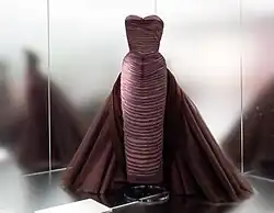 The “Sleeping Beauties” that the exhibition is titled after are the garments themselves, with over 220 pieces dating from the 17th century to the fall 2024 collections displayed.[20] This is the largest Costume Institute show in terms of objects composed exclusively of pieces already in the museum’s collection.[21] The Costume Institute also made 75 new acquisitions for the exhibition.[22] Many of the most fragile garments had to be displayed lying down inside glass boxes for preservation and to mimic the exhibition's theme [23] or were reimagined through video animation.[24] The exhibition included tactile 3D-printed plastic replicas, embroidery-embossed wallpaper, isolated recordings of pieces captured in an anechoic chamber, projections, scratch-and-sniff scents and other smell displays.[25] The Costume Institute set up ChatGPT to allow visitors to "communicate" with socialite Natalie Porter, who wore the Callot Soeurs wedding ensemble that punctuates the show.[26][27] The exhibition featured a Loewe overcoat that sprouted real grass, which had to be replaced by a new version every week because the grass could not survive that long without being watered.[28]