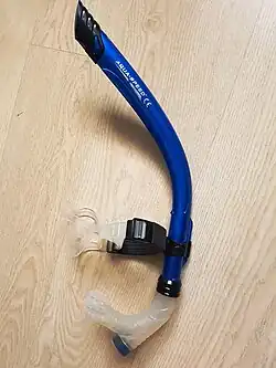 A snorkel is a device used for breathing atmospheric air when the wearer's head is face downwards in the surface water with the mouth and the nose submerged. It may be either a separate unit, or integrated into a swimming or diving mask. The integrated version is only suitable for surface snorkeling, while the separate device may also be used for surface breathing during breathhold underwater activities such as spearfishing, freediving, finswimming, underwater hockey, underwater rugby and for surface breathing while wearing scuba equipment. A standard snorkel is a curved tube with a shape usually resembling the letter "L" or "J", fitted with a mouthpiece at the lower end and made from plastic, synthetic elastomers, rubber, or light metal.[1] The snorkel may have a loop or a clip to attach it to the head strap of the diving mask or swimming goggles, or may be tucked between the mask-strap and the head,[2] or may be provided with its own head strap. Some snorkels are fitted with a float valve at the top to prevent flooding if the top opening is immersed, and some are fitted with a water trap and purge valve, intended for draining water from the tube.
