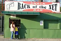 A soccer mom and her child at a refreshment stand at the Metropolitan Oval, a soccer complex in Queens, New York