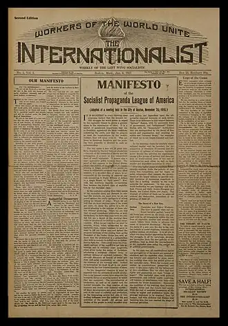 Beginning with an issue dated April 21, 1917, The Internationalist was moved to New York City and published by the Socialist Propaganda League as The New International.[3] Louis Fraina became the publication's editor at that date.[3] The publication was financed through donations made by Dutch engineer and left wing socialist S.J. Rutgers.[2] Circulation was small, estimated by historian Theodore Draper at "no more than a thousand copies of each issue," which served to limit the paper's influence.[4] Nevertheless, Draper and other historians of the American left regard The Internationalist and its successor as the first propaganda organs of the movement which congealed as the Left Wing Section of the Socialist Party in 1919 — forerunner of the American communist movement.[4]