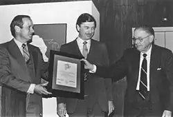 Dennis Reinhartz (professor of history), Charles Lowry (UTA Library Director), and Jenkins Garrett in 1986; lifetime membership in the Society for the History of Discoveries being granted to Garrett