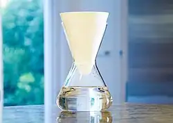 The Soma water filtration system consists of a glass carafe and a biodegradable water filter.[2][3][11] The filters are delivered to customers via a subscription service every two months.[2][11] The filter was designed by David Beeman, who created the water formulas for Starbucks and Peet's Coffee.[11] Soma has also partnered with charity: water to donate clean drinking water to those in need through the sale of every filter.[12]