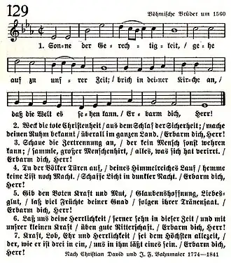 A 1970 ecumenical gathering at the centre of church music education in Schlüchtern suggested a different last stanza, also found in David's hymn.[8][5] The hymn became part of many hymnals, beginning with the Protestant Evangelisches Kirchengesangbuch (EKG) in 1950.[9] It appeared in 1971 in the Hymn Book of the Anglican Church of Canada, in the Dutch Liedboek voor de kerken of 1973.[6] The ecumenical version was included in the Swiss Gemeinsame Kirchenlieder in 1973,[9] in the Catholic Gotteslob of 1975, and in the Czech Evangelicky Zpevnik in 1979.[6] It appears in the current Protestant hymnal Evangelisches Gesangbuch as both EG 262 (ecumenical version) and EG 263 (Riethmüller's version),[2][10] and in the Catholic Gotteslob as GL 481 in the ecumenical version. It is featured in many songbooks.[1]