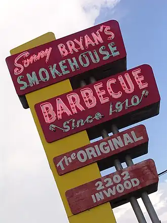 The Bryan family has operated barbecue restaurants in the Dallas area for over a century. Sonny's grandfather, Elias Bryan, first opened his Bryan's Barbecue in 1910[2] while Sonny's father William Jennings "Red" Bryan opened Red Bryan's Smokehouse in 1930.[3] Sonny opened his Sonny Bryan's Smokehouse in 1958 and ran it until 1989 when he sold it to a group of Dallas investors.[4][5][6][7] Bryan died from cancer just a few months after the sale.[8][9]