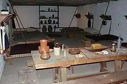 Soldiers of the Company of the National Presidio at San Francisco (Compania de Presidio Nacional de San Francisco) moved to the site of the recently secularized Mission San Francisco Solano in 1835. California Governor Jose Figueroa had ordered the Company north from the Presidio of San Francisco as part of his plan to comply with instructions from the national government to establish a strong garrison in the region north of the San Francisco Bay to protect the area from encroachments of foreigners.[5] An immediate concern was further eastward movement of the Russian America Company from their settlements on the California coast.[6] Construction of the barracks was episodic: digging the foundation began in 1837, construction of the adobe walls in 1839 and the building was more or less completed in 1840 to '41.[7] Until the building was habitable the troops were housed in the buildings of the old Mission.[8] While the barracks was built to house troops, most of the space was used as a headquarters and for supply, equipment and weapons storage.[7]