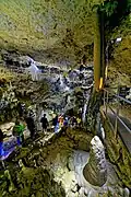 The path leads through a very narrow passage about three meters long to a platform in the upper part of the first section of the cave. Directly in front of the path, which leads there to the left, is the "Elephant's Ear", a free-hanging sinter plume more than one meter long. As a counterpart, a stalagmite has formed at the bottom, the "Beehive". The path then passes the "Oriental City" and turns right in a semicircle. The "Oriental City" is located halfway up on the left in a small cavity and consists of numerous candle stalagmites. Afterwards a staircase leads more than ten meters down, where a cave bear of the small cave bear race Ursus spelaeus eremus,[20] assembled from bones, can be found. The sintering on the right wall reminds of a waterfall and gave reason to give the formation the same name. On the ceiling there are sinter flags, sporadically also sinter tubes. On the floor there are prehistoric and protohistoric bones covered with sinter mass, especially reindeer antler poles and a mammoth basin deposited in one place by the Cromagnon people of the Gravettian, probably in a shamanic context in the cave. Stalagmites with drop funnels have also formed in several places.