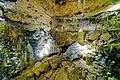 Sophie Cave is located in fossil sponge reefs in the Franconian dolomite of the Jurassic Malm. The 18-meter wide, six-meter high[1] and uphill tapering entrance portal has a dome-shaped structure. The cave has dome-like halls, some of which are connected by narrow, winding passages. This is typical for caves in the Franconian dolomite. The cave is essentially drawn along the horizontal joints of the sponge reefs. These surface forms can be traced particularly well in the third section on the basis of joints. With a size of 42 × 25 × 11 meters[2] it is one of the largest Franconian cave rooms. Here, large rubble blocks have detached from the ceiling along the joints and cover the floor. The other two compartments also have rubble blocks, which in some places are covered by dripstones. The spatial appearance of the cave indicates a great age.