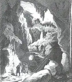The count visited the cave on June 21, 1833, with his eldest son Erwin and his wife Sophie (born Countess zu Eltz). He then named the cave Sophienhöhle in honor of his daughter-in-law.[10] He had the cave carefully prepared for visitors with stairways and pathways. During the development measures, the Maple Hole and the Klausstein Cave were completely leveled. After the discovery of the cave, numerous scholars came to study it more closely.