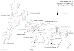 The Sophie Cave consists of a complex of a total of four caves: the entrance portal, which has always been known, the Ahornloch, the adjoining Kleinstein Cave, the actual Sophie Cave discovered in 1833 and the Hösch Cave, which was initially filled in. Together, the individual caves form the Kleinstein Cave complex or Sophie Cave. It has a length of about 900 meters,[2] with the actual Sophie Cave with its three sections being 500 meters long. In the cave register Franconian Alb, which has more than 3000 caves in an area of 6400 square kilometers, the Sophie Cave is registered as B 27 and the Hösch Cave connected to it as B 24.[4] The cave is designated as geotope 472H009[5] by the Bavarian State Office for the Environment. See also the list of geotopes in the district of Bayreuth.