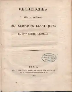 35. ^ This is equation (B) in Germain's own book. Sophie Germain (1821). Recherches sur la théorie des surfaces élastiques. p. 27.