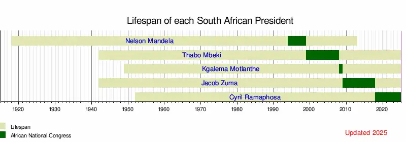 | The fourth post-apartheid president of South Africa. Presided over the centennial celebration of the ANC in 2015 as well as the death of Nelson Mandela in 2013. With less than a year before his term was to expire, Zuma resigned on 14 February 2018 following the demands of the ANC that Zuma should resign, or risk facing a successful vote of no confidence by the National Assembly. | ||||||||||