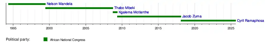 The president is elected by the National Assembly, the lower house of Parliament, and is usually the leader of the largest party, which has been the African National Congress since the first multiracial election was held on 27 April 1994. The Constitution limits the president's time in office to two five-year terms.[2] The first president to be elected under the new constitution was Nelson Mandela. The incumbent is Cyril Ramaphosa, who was elected by the National Assembly on 15 February 2018 following the resignation of Jacob Zuma.