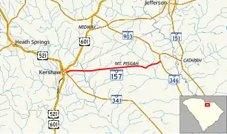 South Carolina Highway 157 (SC 157) is a 10.210-mile-long (16.431 km) state highway in the Sandhills region of the U.S. state of South Carolina. Though it physically travels west to east, it is signed as a north–south highway. Its southern terminus (eastern end) is at SC 346 about two miles (3.2 km) west of Catarrh. Its northern terminus (western end) is at SC 341 in Kershaw. This is also the southern terminus of SC 157 Truck and SC 341 Truck.
