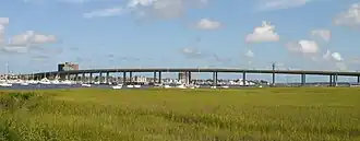 The bridge across the Ashley River is named the Robert B. Scarborough Bridge, named for a former state legislator and highway commissioner. The bridge is 2.9 miles (4.7 km) long and cost $124.7 million to build.[3] The bridge also crosses Wappoo Creek, which is a part of the Intracoastal Waterway.