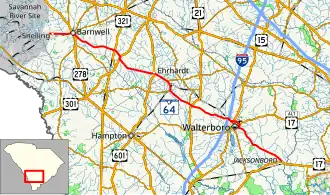 South Carolina Highway 64 (SC 64) is a 73.730-mile (118.657 km) primary state highway in the U.S. state of South Carolina. It serves the cities of Barnwell and Walterboro while also providing a direct route to Charleston, via US 17.[4]