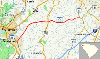 The route travels generally in a west–east direction, signed to begin at an intersection with SC 28 Business (SC 28 Bus.; North Mechanic Street) in downtown Pendleton. However, SCDOT designates the western terminus to not start until North Broad Street a few blocks later. East of Pendleton, SC 88 travels through somewhat rural areas and has a roundabout intersection with US 178. The route continues until it terminates at an intersection with SC 8, west of the suburban areas of Powdersville.[2][3]