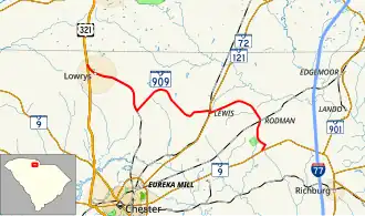 South Carolina Highway 909 (SC 909) is a 14.060-mile (22.627 km) primary state highway in the U.S. state of South Carolina. It connects the communities of northern Chester County.