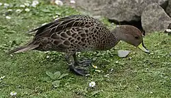 The South Georgia pintail (Anas georgica georgica), also misleadingly known as the South Georgian teal,[2] is the nominate subspecies of the yellow-billed pintail (Anas georgica), a duck in the dabbling duck subfamily Anatinae. It is endemic to the large (3,756 km2) subantarctic island of South Georgia and its accompanying archipelago, and is a vagrant to the South Sandwich Islands.[3] It was among the birds noted by James Cook in January 1775, on the occasion of the first recorded landing on South Georgia,[4] and was formerly considered a full species.