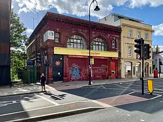 South Kentish Town station was opened on 22 June 1907 by the Charing Cross, Euston & Hampstead Railway (CCE&HR) on its branch to Highgate (now Archway).[1] The station was planned to be called Castle Road; however, this was changed just before it opened. The Castle Road name had already been fired into the original Leslie Green tiles inside the station, so after the name change they were painted over with the revised name.