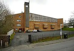 The only vestiges of the old scheme that now remain are the large St Bernard's Catholic Church (designed by Glasgow architect Thomas Cordiner and opened in December 1963)[5] and the Sky Dragon take-away shop (est 1989), both on Wiltonburn Road.[3] This parish and family-run business still survives despite the destruction of all around.