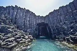 South Penghu Marine National Park is between 23°14' and 23°17' N, and between 119°30' and 119°40' E.[1] It is in Wangan Township.[7] Its total area is about 358.44 km2, with 354.73 km2 of water and 3.70 km2 of land.[9] The islands have basalt landforms, including columnar basalt. There are abandoned houses and a few temples on the islands.[7] There are also walls built of stone, called "cai zhai", that were used to protect vegetables from strong winds. There is a lighthouse on Dongjiyu.[5] The "Blue Cave" is a sea cave on Xijiyu.[7]