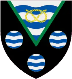 Sable on a pile harry wavy Argent and Azure fimbriated Vert a Stafford knot Or all between three fountains.