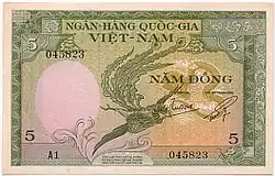 In 1953, notes (dated 1952) were introduced by the Institut d'Emission des Etats du Cambodge, du Laos et du Vietnam in denominations of 1, 5, 10, 100 and 200 đồng. On 22 September 1955, the Ministry of Finance and Economic Affairs announced that notes from the Bank of Indochina and the Institut d’Emission issues for Cambodia and Laos would be exchanged for Institut d’Emission issues for Vietnam starting 30 September until 7 November. The Institut issues for Cambodia and Laos ceased to be legal tender on 7 October, and all Bank of Indochina notes lost their legal tender status on 31 October following the 15 October introduction of the first notes from the National Bank of Vietnam.[3] Subsequently, the Ngân-Hàng Quốc-Gia Việt-Nam (National Bank of Vietnam) took over the issuance of paper money, introducing 2 and 500 đồng notes in 1955 and 20 and 50 đồng in 1956. Between 1964 and 1968, notes below 50 đồng were replaced by coins. In 1971, 1000 đồng notes were introduced. Due to steady inflation, 5000 and 10000 đồng notes were printed in 1975 but not issued due to the fall of Saigon.