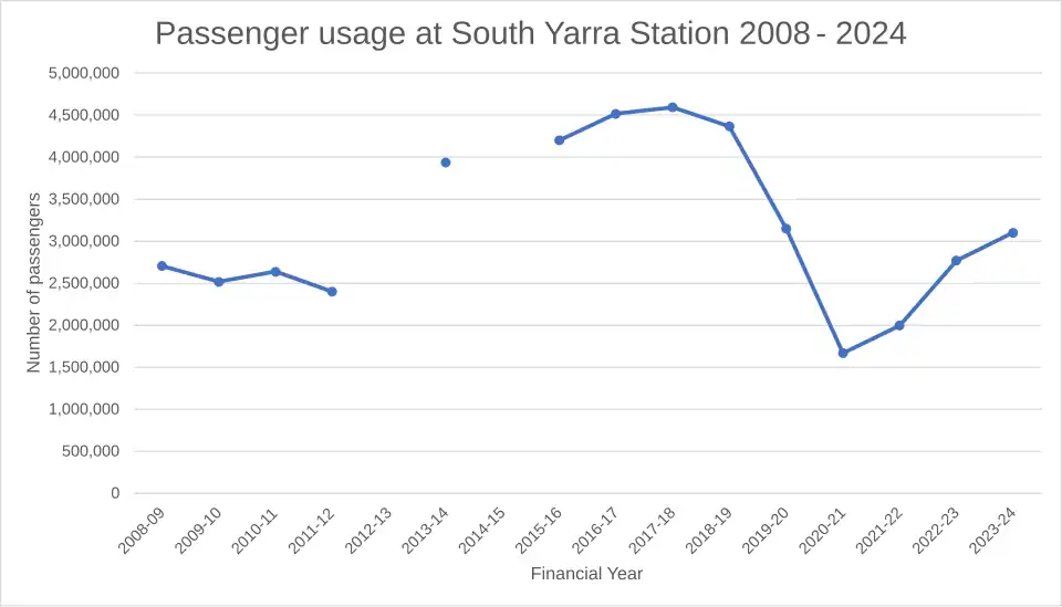 According to Public Transport Victoria data, South Yarra is the eighth-busiest station on the Melbourne metropolitan network, with 4.59 million boardings per year during the 2017/2018 financial year.[12][13]