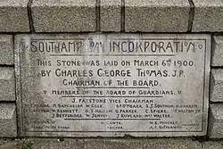 The hospital was founded in 1900 as the Southampton Union Infirmary in Shirley Warren, Southampton, to replace hospital beds previously provided at the workhouse infirmary in St Mary's, Southampton. The Royal South Hampshire Hospital was the voluntary hospital, founded in 1835 in the city.[1] The initial 35-acre (14 ha) site cost the Poor Law Guardians £8,200, and the foundation stone was laid on 31 March 1900.[1] The original building, housing 289 beds, cost £64,800 to construct; it has since been demolished.[1]