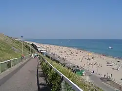 Southbourne's primary attraction is its sandy Blue Flag beach, which is considered quieter compared to the more crowded beach along the coast at Bournemouth.[10] Between the clifftop coastal road and the promenade and beach is the Fisherman's Walk Cliff Railway, a funicular railway that provides access to Southbourne beach.