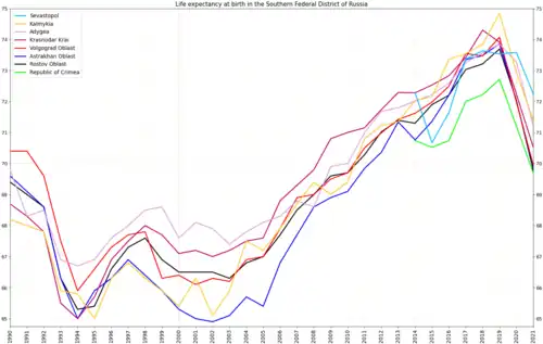 Life expectancy at birth in the Southern Federal District, 1990–2021[16][17]