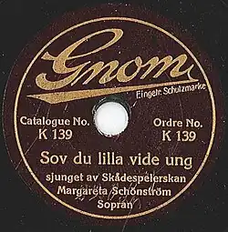 - ^ Sov du lilla vide ung; Gud, som haver barnen kär, sung by actress Margareta Schönström, soprano. Stockholm: Skandinaviska Polyphon. May 1925. Accessed 9 August 2011.